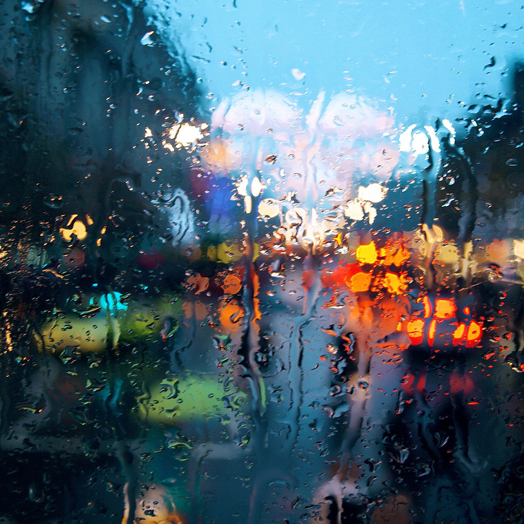 - Дождливая погода в городе, фото сделанное через стекло по которому стекают капли дождя Фото обои для iPad
